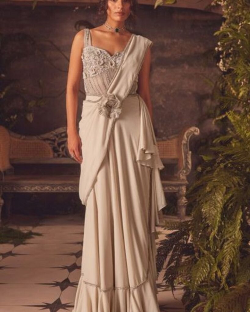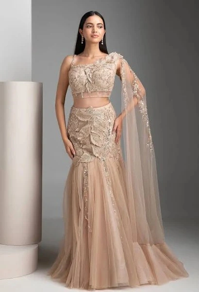 It also reflects how fashion is shifting toward modern indian wedding dresses that mix subtle shimmer with clean lines. The layered textures and polished finish make this piece a great pick for receptions, cocktails or any moment where you want to look refined and trendy.