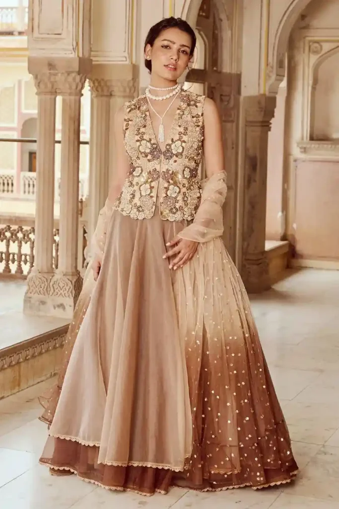 This look brings a lively and effortless charm to stylish indian wedding outfits. The soft ombre skirt paired with the embellished blouse feels playful yet elegant, while the long flowy jacket adds a cool, standout touch. It’s the kind of outfit that keeps you comfy and still makes you look ready for any big celebration.