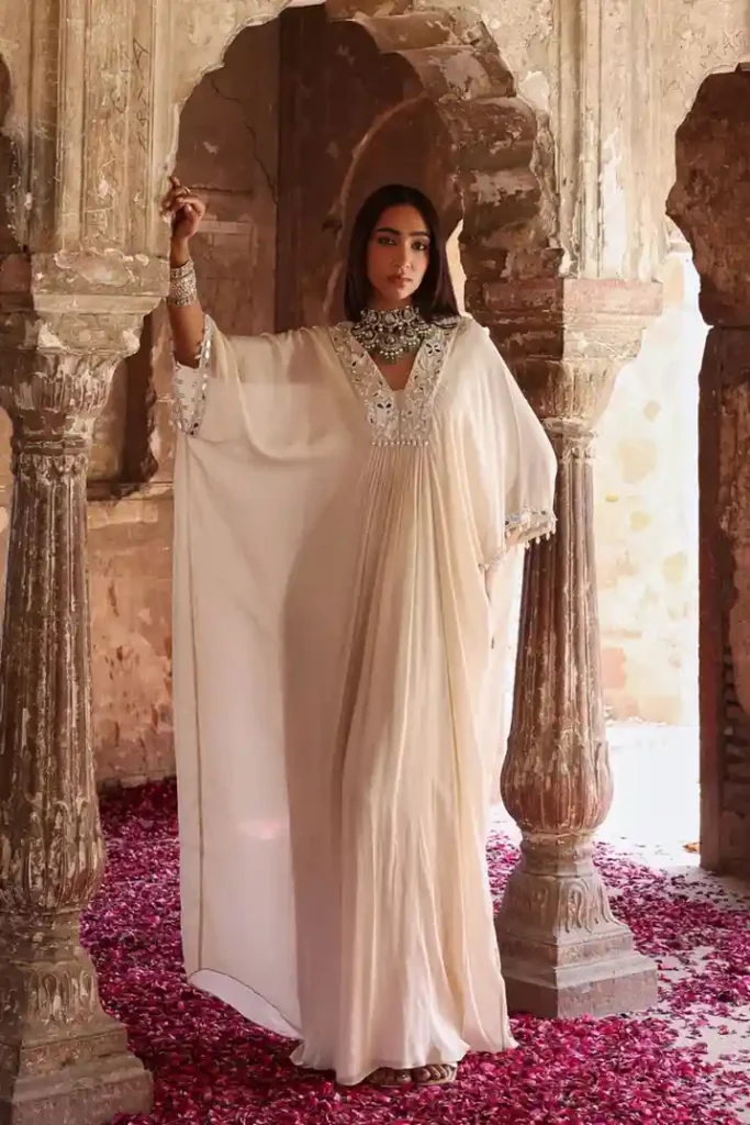 This ivory kaftan-style outfit brings a soft, regal vibe to stylish Indian wedding outfits. The flowy silhouette, paired with the detailed neckline and cuffs, makes it look elegant while still keeping things easy and relaxed. It’s the kind of look that feels effortless but still makes a strong impression at wedding events.