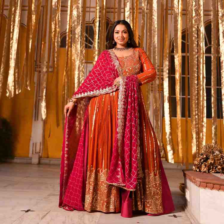 This orange and pink anarkali brings a rich and traditional vibe to stylish Indian wedding outfits. The heavy embroidery, bold colors and flowy silhouette make it perfect for grand celebrations. It gives that regal feel while still keeping the look warm and inviting.
