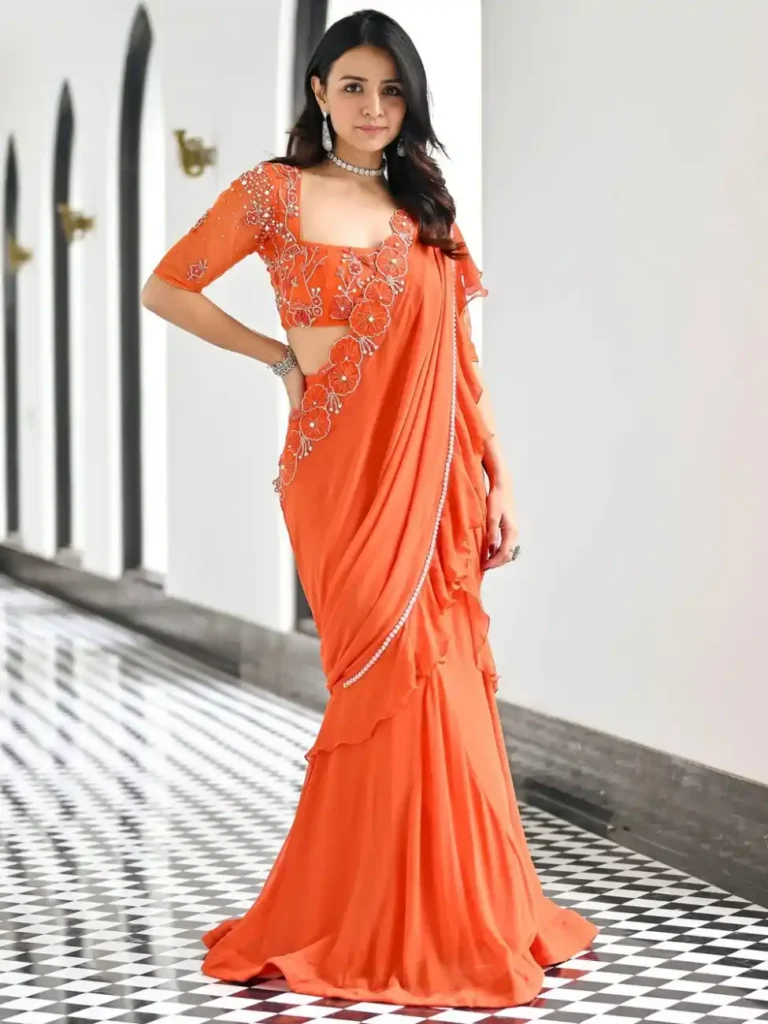 This bright orange saree-gown brings a fun and confident vibe to stylish Indian wedding outfits. The sleek drape and detailed blouse make it feel festive while still keeping things clean and modern. It’s the kind of look that instantly lifts your mood and makes you stand out at any wedding function.