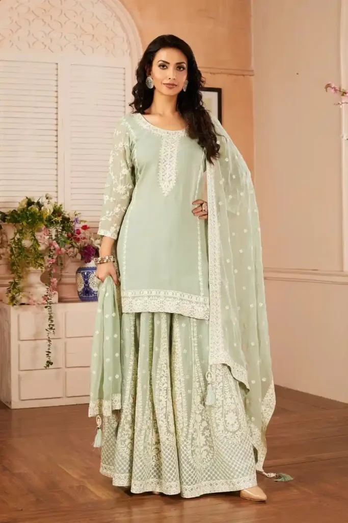 Soft Pastel Wedding Charm. The look shows how modern Indian wedding dresses can feel calm and elegant at the same time. The pastel shade, the delicate embroidery, and the flowy sharara pants give it a sweet and polished vibe. It’s a nice pick for anyone who loves stylish Indian wedding outfits that look traditional but still feel fresh.