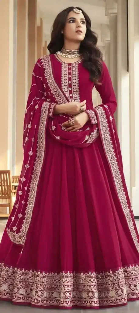 Classic Maroon Wedding Grace outfit brings a royal spin to modern Indian wedding dresses with its rich maroon color and neat embroidery. The long flowy silhouette gives it a soft, elegant look that works beautifully for big functions. It’s a great pick for anyone who loves stylish Indian wedding outfits that feel timeless but still fit today’s fashion mood.