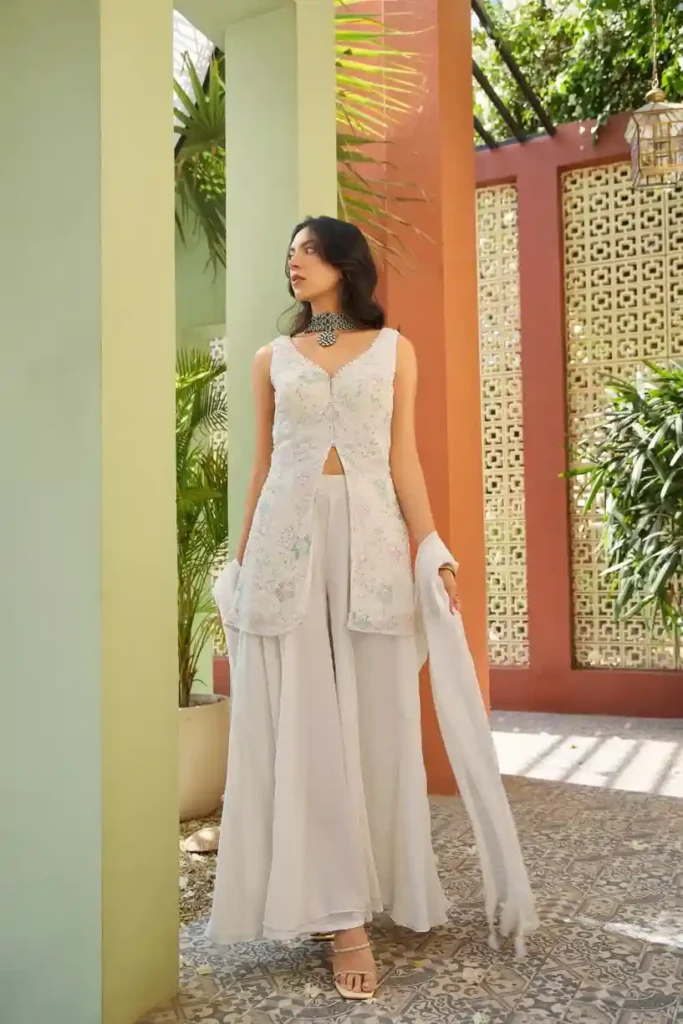 This all-white outfit brings a clean and refreshing vibe to stylish Indian wedding outfits. The flowy palazzos paired with the embroidered blouse create a look that feels light, polished and perfect for daytime functions. It’s simple but still has that soft glam that works so well at weddings.