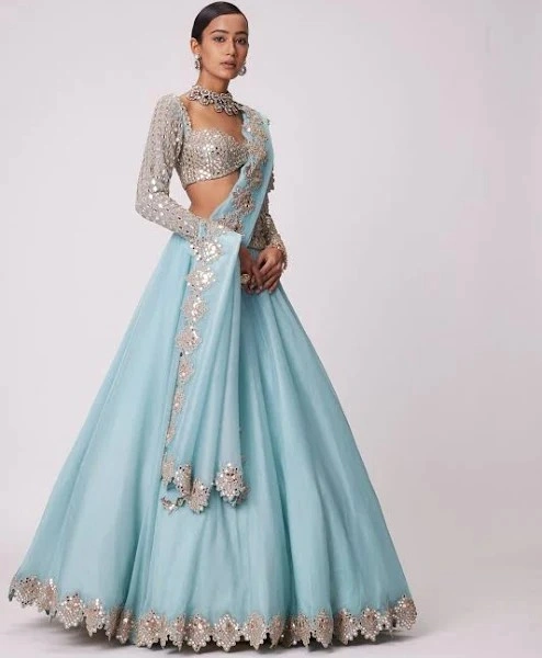 This look is all about blending tradition with a fresh, modern vibe. The soft blue lehenga paired with the detailed silver blouse gives a clean and elegant feel that fits perfectly into stylish indian wedding outfits. The flowy fabric and fine work make it a go-to choice for anyone who wants to look polished without trying too hard.